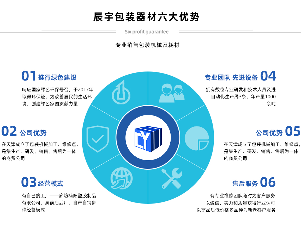 天津辰宇包裝器材有限公司原天津市辰宇商貿有限公司,位于天津市南開區密云一支路新南馬路五金城二區33棟106號,本公司主要經營:打包帶,打包機系列,封箱機系列,纏繞機系列,拉伸膜,膠帶,尼龍繩,其他包裝耗材等產品 公司產品質優價廉,暢銷全國各大城市。同等質量比價格,同等價格比質量,我們確保質量,價錢合理,交貨迅速及時。公司始終秉承“精益求精,鑄造品質的典范”的經營理念,真誠為廣大客戶提供真誠的服務! 天津市辰宇包裝器材有限公司,感謝廣大新老客戶的鼎力支持,竭誠歡迎社會各界朋友前來洽談業務,愿真誠合作攜手共創美好未來!